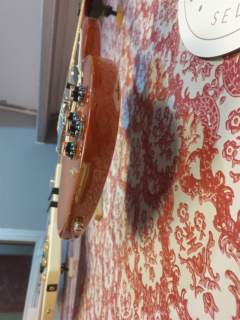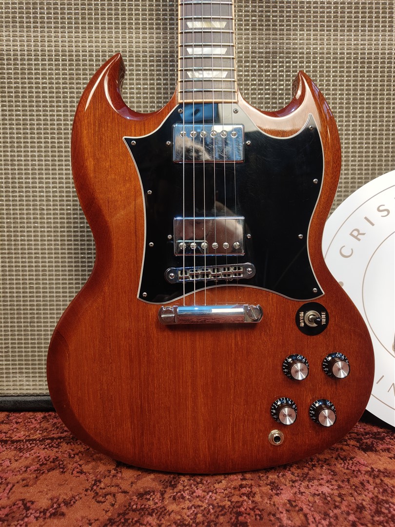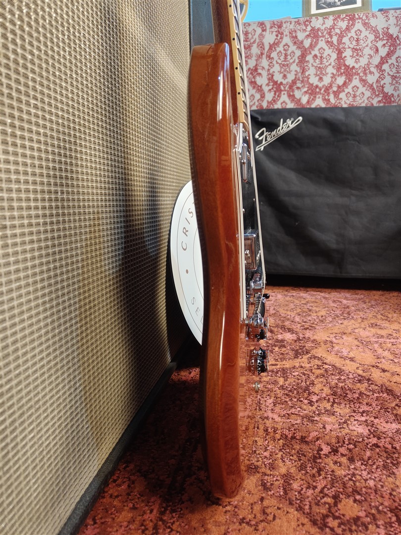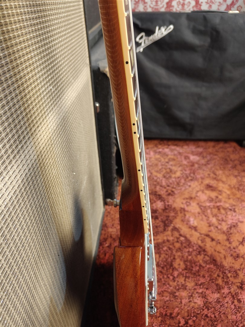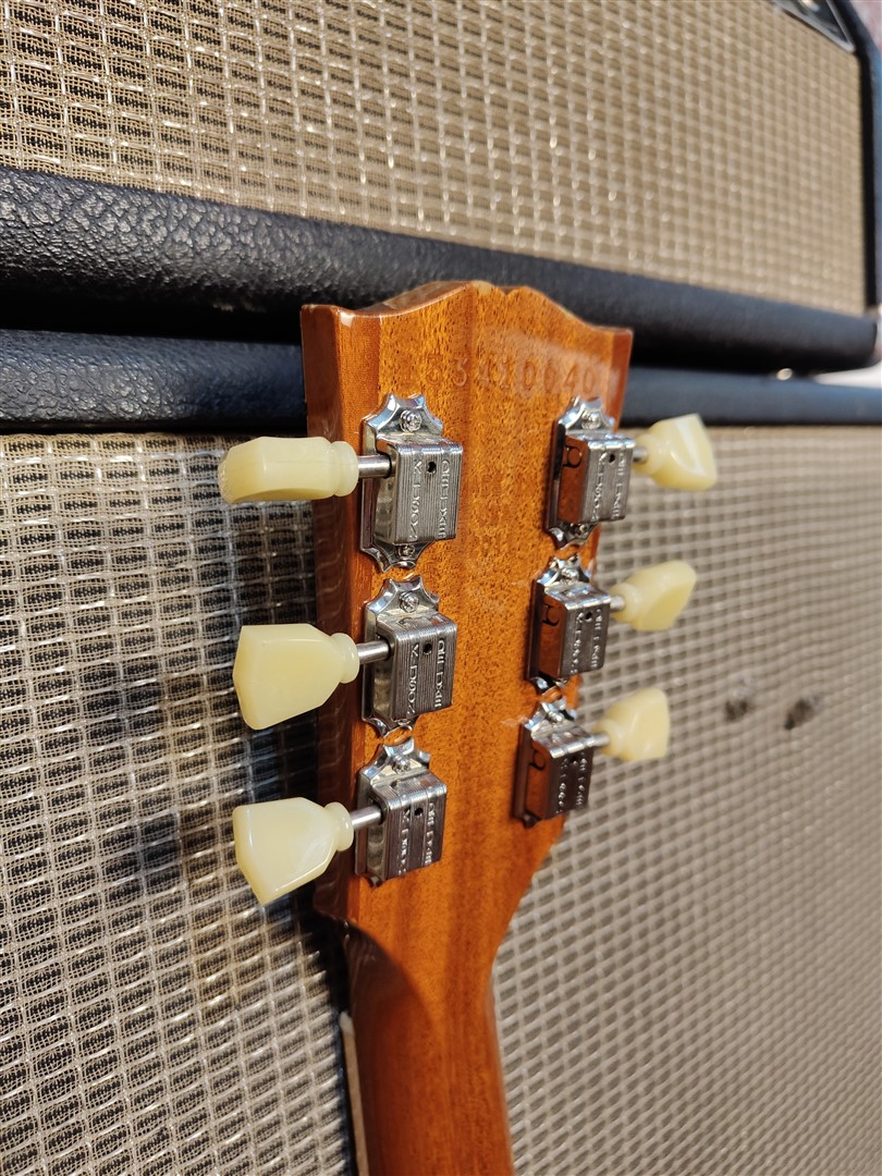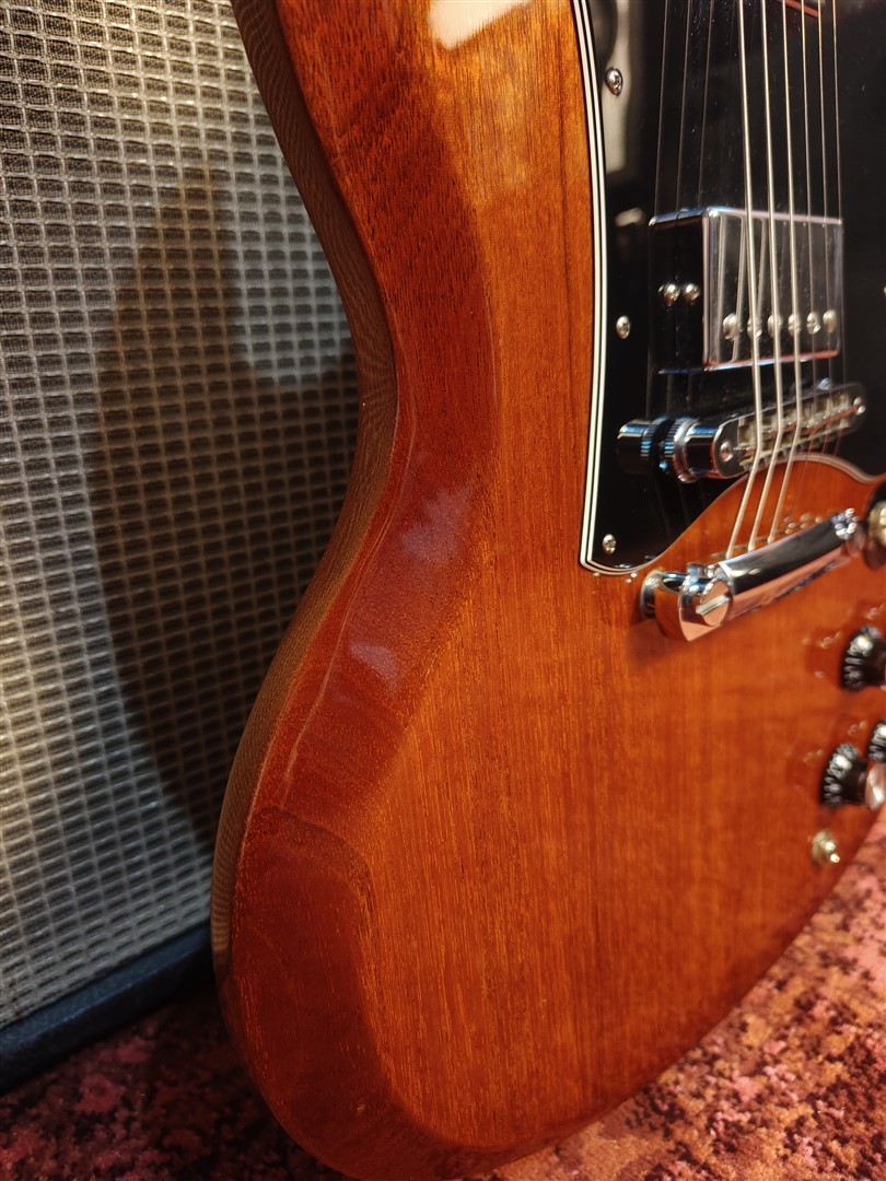 Questa SG Standard del 2011 si presenta in una elegante finitura Natural Burst, con il mogano lasciato libero di esprimersi in modo lineare e uniforme, senza sfumature forzate o artifici cromatici. La venatura resta visibile, autentica, senza maschere.